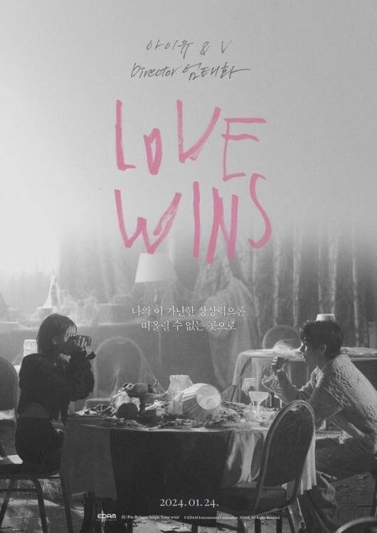 선공개곡 제목은 'Love Wins' 아이유와 방탄소년단 뷔가 앉아 서로 마주보며 노래를 부릅니다.